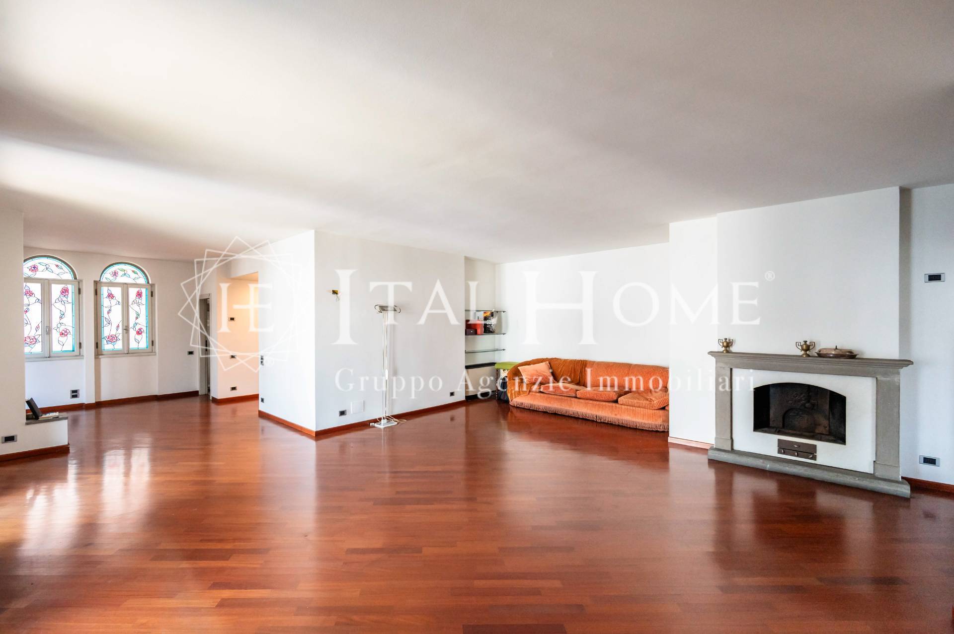 Internamente troviamo: spazioso ingresso, area guardaroba, immenso salone con quadruple vetrate e camino antico a vista, zona pranzo con salottino e accesso alla prima terrazza, una grande cucina abitabile con doppia vetrata e la lavanderia; a seguire, disimpegno notte, 5 camere da letto, 4 bagni e un ulteriore ambiente ripostiglio, oltre alla seconda balconata, lunga tutto un lato della casa.
