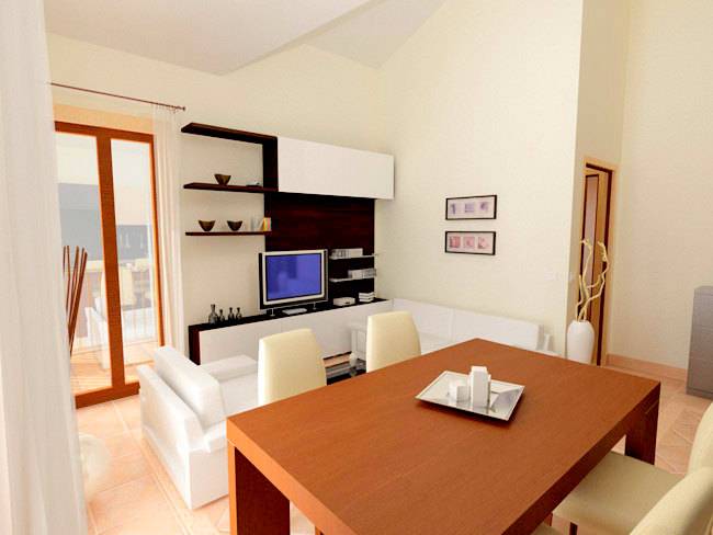 Internamente si compone di: ingresso, soggiorno con cucina a vista, disimpegno notte, una camera da letto matrimoniale e un servizio finestrato.