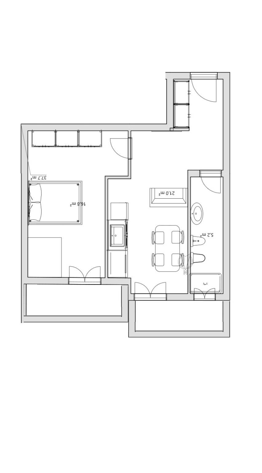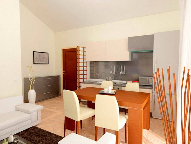 Internamente si compone di: ingresso, soggiorno con cucina a vista, disimpegno notte, una camera da letto matrimoniale e un servizio finestrato.